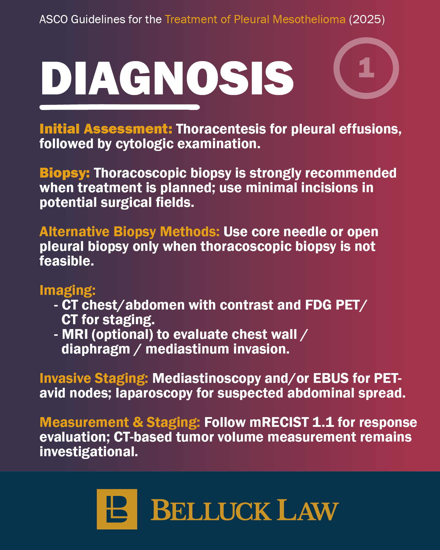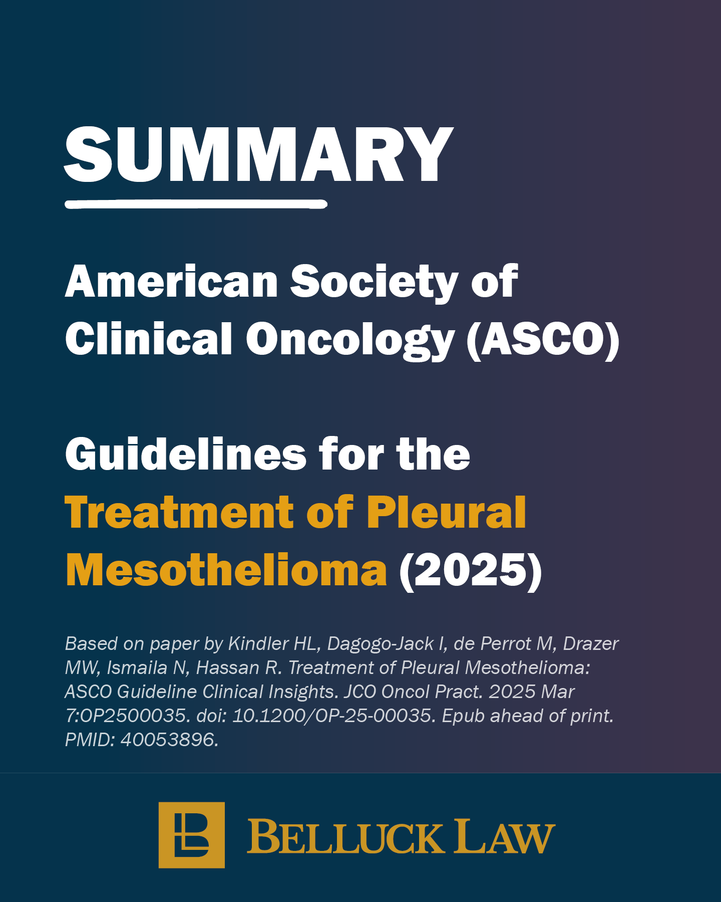 Earlier this year, the American Society of Clinical Oncology (ASCO) published an update to its 2018 guideline for the treatment of pleural mesothelioma. This summary of the guidelines is based on the published manuscript by Kindler HL, Dagogo-Jack I, de Perrot M, Drazer MW, Ismaila N, Hassan R. Treatment of Pleural Mesothelioma: ASCO Guideline Clinical Insights. JCO Oncol Pract. 2025 Mar 7:OP2500035. doi: 10.1200/OP-25-00035. Epub ahead of print. PMID: 40053896.