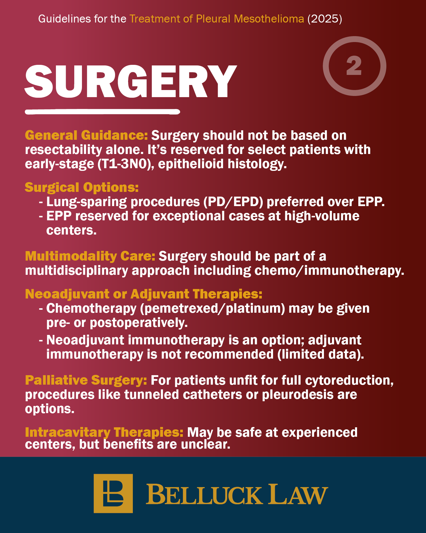 General Guidance: Surgery should not be based on resectability alone. It’s reserved for select patients with early-stage (T1-3N0), epithelioid histology.