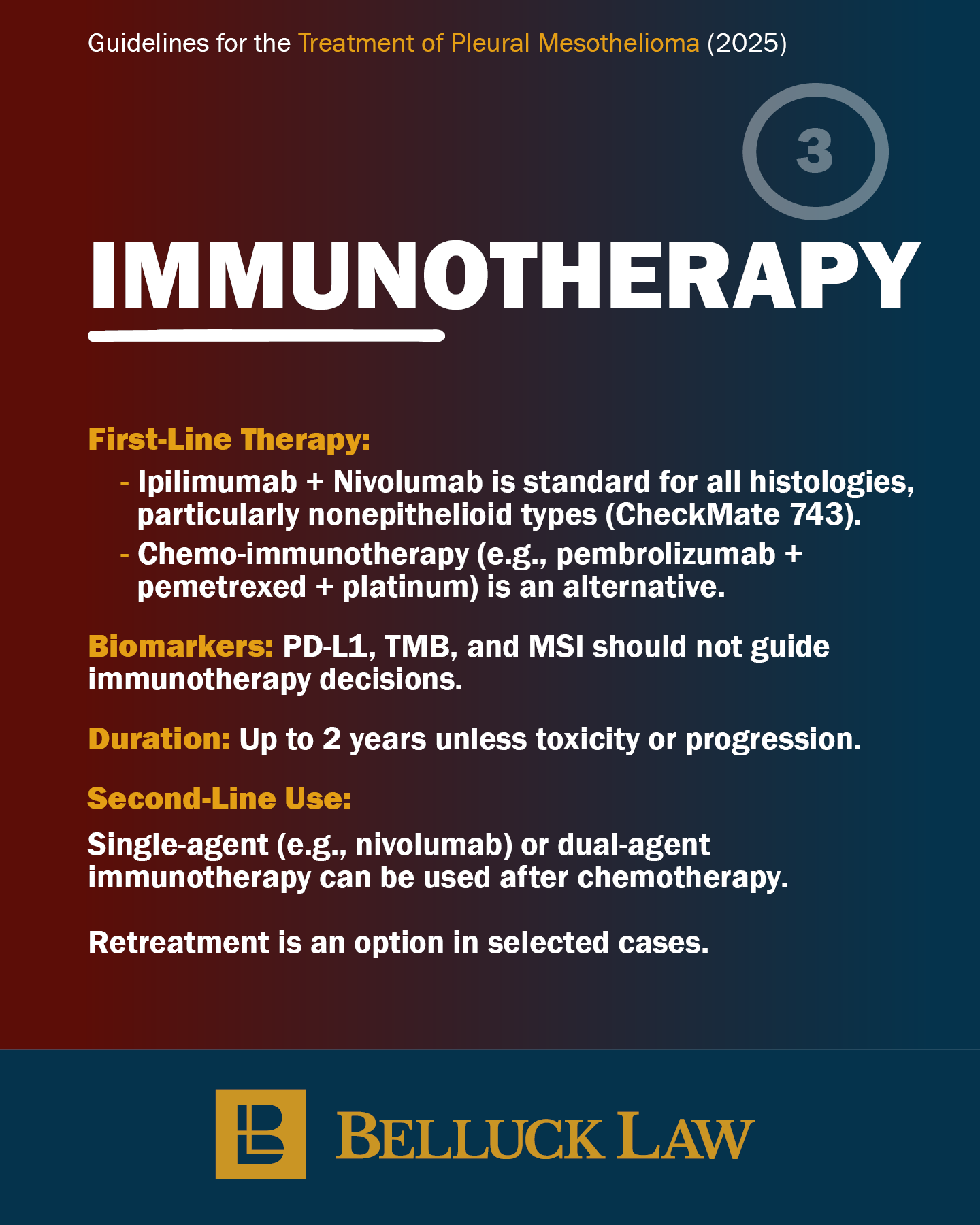 - Ipilimumab + Nivolumab is standard for all histologies, particularly nonepithelioid types (CheckMate 743).